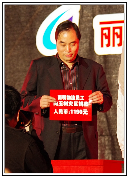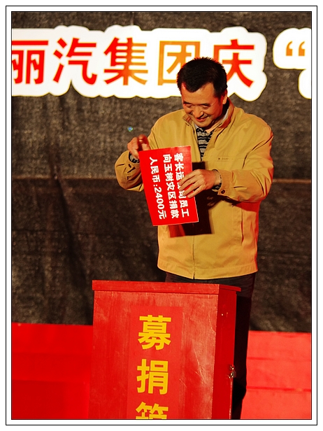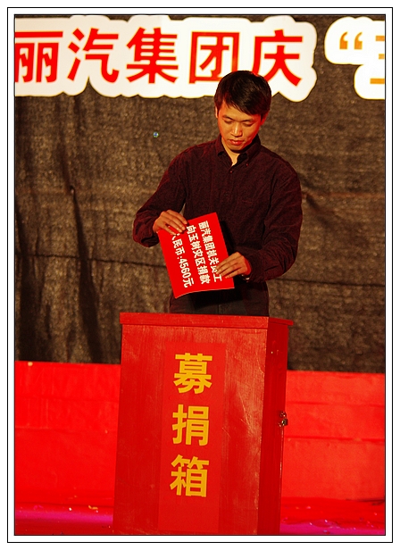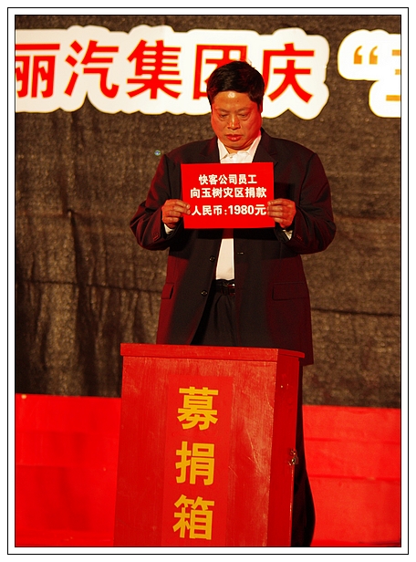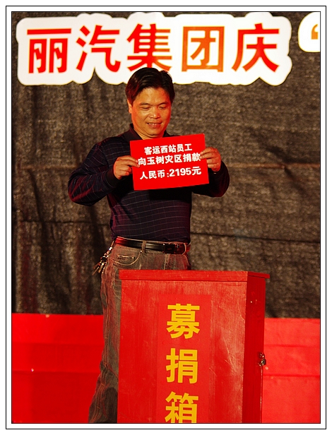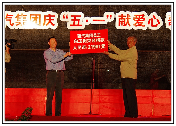 演唱會上,麗汽集團(tuán)員工為玉樹地震災(zāi)區(qū)進(jìn)行了捐款,所募集的21981元善款轉(zhuǎn)交市慈善總會。