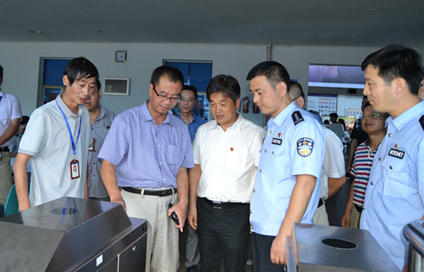 7月13日下午,市委常委、區(qū)委書(shū)記葛學(xué)斌、蓮都區(qū)公安局局長(zhǎng)葉建利等領(lǐng)導(dǎo)在集團(tuán)公司董事長(zhǎng)葉茂的陪同下到客運(yùn)東站調(diào)研護(hù)航G20安保工作情況。一行人經(jīng)過(guò)人物分離的安檢通道進(jìn)入長(zhǎng)途班車候車廳,在聽(tīng)取東站經(jīng)理江小華介紹下親自體驗(yàn)了客運(yùn)東站新安裝的實(shí)名檢票系統(tǒng)。葛書(shū)記對(duì)客運(yùn)東站的安保工作表示滿意,強(qiáng)調(diào)護(hù)航G20工作已經(jīng)進(jìn)入臨戰(zhàn)階段,作為車站要切實(shí)加強(qiáng)出入安全檢查,扎實(shí)做好各項(xiàng)安保工作,堅(jiān)決打贏“護(hù)航G20,平安奪金鼎”這場(chǎng)硬戰(zhàn)爭(zhēng)。