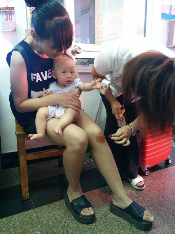 王月梅趕緊扶起了這位媽媽,并接過了她手里的寶寶,一邊哄著受驚嚇的寶寶,一邊幫忙收拾好散落的衣物,然后扶著年輕媽媽來到服務(wù)處的椅子上坐下。已經(jīng)身為人母的王月梅,對哄寶寶這種事已經(jīng)是輕車熟路了,不一會(huì),寶寶就被哄笑了。寶寶沒事了她又馬上從服務(wù)處的醫(yī)藥箱內(nèi)找出碘伏、棉花、藥水,小心翼翼地為她消毒、上藥。