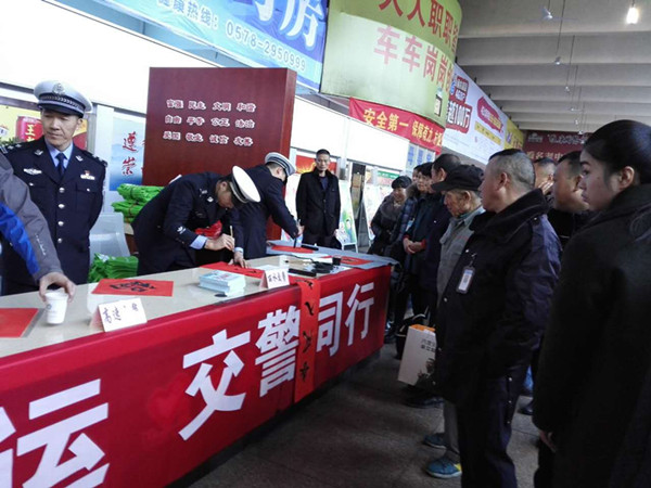 今天麗水市高速交警同志也給旅客帶來可驚喜,他們揮動手中的毛筆為旅客寫下一幅幅承載著吉祥、平安的春聯(lián),旅客們拿著春聯(lián)露出幸福的笑容,為春運(yùn)添上了一抹光彩。