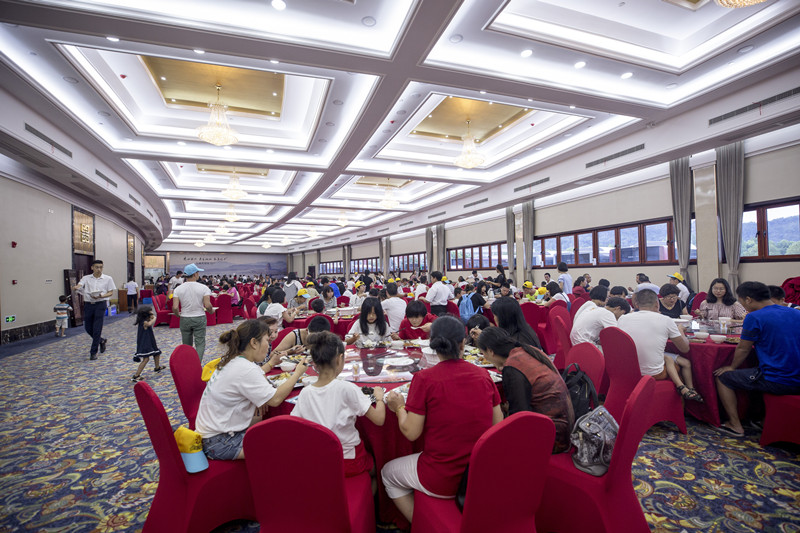 8月13日晚上,九城宴會中心熱鬧非凡,宴會大廳及休閑中廳擺滿了桌椅,紅色的桌椅布套顯得格外喜慶,酒店門前停滿了旅游大巴車,進店的游客排起了長長的隊伍,這是九城宴會中心自開業(yè)以來接待的首場千人宴。