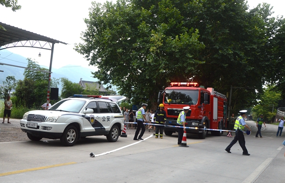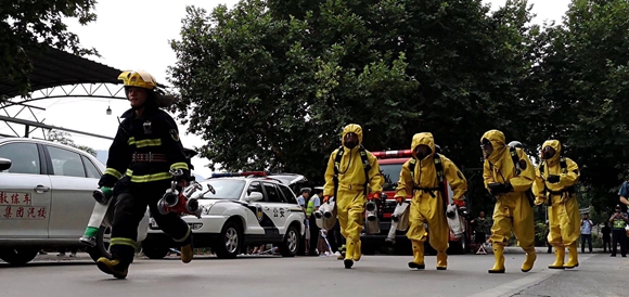 120趕到救治傷員、環(huán)保監(jiān)測人員進行現(xiàn)場監(jiān)測