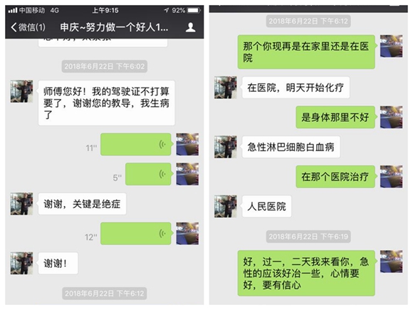 經(jīng)核實,這條消息是浙K0058教練車學員梅申慶發(fā)出的求助消息,該車教練員周偉在6月22日也收到了學員梅申慶的微信留言,表示不能繼續(xù)學車了,周偉就很納悶,問他好好為什么不學了。梅申慶回答說自己生病了,而且得的是絕癥--突發(fā)性白血??!周偉教練當時感到很震驚,想不到前幾天來學車時還好好的一個學員,怎么突然間就得了重病。他知道白血病治療需要巨額費用,梅申慶家經(jīng)濟條件又不是很好,當即發(fā)了188塊微信紅包鼓勵梅申慶樹立信心、積極接受治療。
