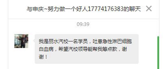 6月27日,麗汽集團汽車技術(shù)學校的微信公眾號收到一條來自學員的消息:“我是麗汽汽校的一名學員,突患急性淋巴細胞白血病,希望汽校領(lǐng)導能幫我籌點款,謝謝!”