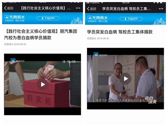 得知麗汽集團汽校這樣一家培訓機構(gòu),能自發(fā)為身患重病的外地學員組織愛心捐款后,麗水公共頻道新聞和文化休閑頻道老白談天欄目專門就這一事件進行了專題報道,稱贊這是一個踐行社會主義核心價值觀的愛心故事。
