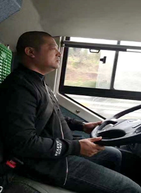 “我是這班車駕駛員,來,我?guī)湍!薄澳倪@件行李較大,我?guī)湍旁谶@個(gè)角落,您記一下,到時(shí)候您下車的時(shí)候直接到這找行李,如果拿不出來喊我們一聲就行”。由于返鄉(xiāng)的民工行李較多,班車行李艙容量有限,檢票上車時(shí)葉東洪總是站在行李艙旁接過每一位乘客的行李并小心地安放在行李艙內(nèi)?!奥闊┠懔藥煾怠薄皫煾堤兄x你了”“師傅你人真好”。面對乘客的道謝葉東洪總是微笑答道:“沒事沒事,應(yīng)該的,應(yīng)該的?!?br/>“旅客朋友們大家好,我是本次行程的駕駛員葉東洪,這是我的同事夏建飛,歡迎乘坐本次班車,路上期間如果有什么要求或者需要幫助隨時(shí)歡迎和我們提出,我們會竭誠為您服務(wù)?!比~東洪檢查完每位乘客的安全帶后,隨著行車員的一聲指令,車輛緩緩駛出發(fā)車區(qū)踏上返鄉(xiāng)行程。