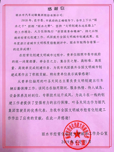 信中還特別表揚了從集團公司抽用的葉圣天同志,在工作中服務(wù)熱情、待人誠懇、設(shè)備保養(yǎng)及時到位、專職技術(shù)運斤成風(fēng),為戰(zhàn)斗在一線的創(chuàng)建工作者提供了堅強有力的出行保障。葉圣天同志作為麗汽集團抽用的、主要負責(zé)文明創(chuàng)建出行車輛后勤保障工作的優(yōu)秀駕駛員代表,為我市全國文明城市經(jīng)常化創(chuàng)建工作作出了應(yīng)有的貢獻。