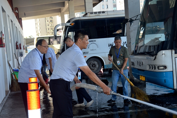 “一二三,加油……” ,“這里有一堆垃圾,快點(diǎn)拿掃把過來……”。為深入推進(jìn)創(chuàng)建文明城市,不斷提升社區(qū)環(huán)境面貌,迎接“國慶70周年”和文明城市測評,9月23日下午,長運(yùn)(東站)組織員工開展衛(wèi)生大清掃活動,清理站區(qū)內(nèi)垃圾?;顒又?,大家手拿掃把、鋤頭和垃圾鉗,運(yùn)用消防水帶,重點(diǎn)對站場地面油污、綠化帶上的雜草、垃圾桶臟污破損等問題,進(jìn)行了全面排查和清理。她們相互協(xié)作,或清除路面的煙頭雜物,或徒手將雜草和泥土裝運(yùn)上車……不一會兒,大家的衣衫都被汗水浸濕,但勞動熱情依然十分高漲。經(jīng)過近兩個小時的全力奮戰(zhàn),侵占道路的垃圾、雜物全部被清理干凈。