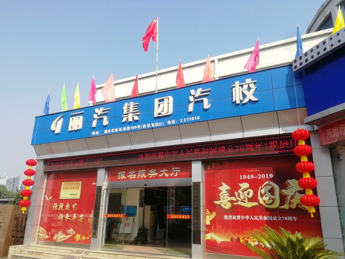 鮮艷的五星紅旗懸掛在汽校報(bào)名注冊(cè)中心大門頂端,四周插著五顏六色的旗幟,在藍(lán)天的映襯下顯得格外耀眼。大門兩側(cè),兩排喜慶的紅燈籠隨風(fēng)搖曳,烘托著祥和的節(jié)日氛圍。LED屏上,“熱烈慶祝中華人民共和國(guó)成立70周年”、“祝愿?jìng)ゴ蟮淖鎳?guó)永遠(yuǎn)繁榮昌盛”的標(biāo)語滾動(dòng)播放,氣氛濃厚?!跋灿瓏?guó)慶”的巨大金色標(biāo)語和汽校“傳授技藝、傳承平安”核心價(jià)值的巨幅廣告相互輝映,相得益彰。