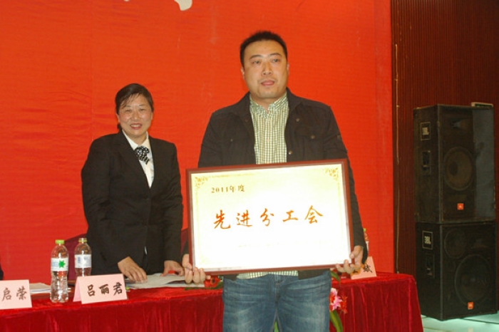 工會主席呂麗君為先進(jìn)分工會頒獎(jiǎng)