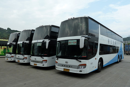 根據(jù)杭州線客流穩(wěn)中有升,尤其是周末及節(jié)假日運(yùn)力不足的情況,8月3日,快客分公司新購置的4輛55座安凱客車上線營運(yùn)。新購置的55座安凱豪華客車為雙層豪華大巴,上層40座,下層15座。下層配備3臺(tái)15寸液晶,上層配1臺(tái)17寸彩色液晶,該車的倒車監(jiān)視器還帶多動(dòng)畫面,能手動(dòng)切畫,監(jiān)視上下層車內(nèi)情況,配備電子巡航系統(tǒng)等。車身13.7米,比原杭州線所用的37座安凱客車車身長1.7米。