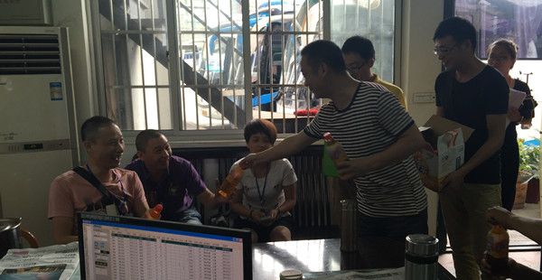 經(jīng)理梁巍、副經(jīng)理王斌、計(jì)財(cái)科科長厲志南和運(yùn)務(wù)科的蔡亞飛各捧著一箱冷飲去送清涼。
