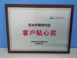 近年來(lái),伊翔公司在主抓生產(chǎn)的同時(shí),講實(shí)效、重管理,不斷完善企業(yè)內(nèi)部管理制度,服務(wù)質(zhì)量日趨提升。日前,從北京現(xiàn)代公司總部傳來(lái)喜訊:麗水市伊翔汽車銷售服務(wù)有限公司榮獲北京現(xiàn)代汽車有限公司頒發(fā)的“客戶貼心獎(jiǎng)”和“M/S進(jìn)步獎(jiǎng)”,王明敬獲北京現(xiàn)代2012年度“優(yōu)秀銷售顧問(wèn)”稱號(hào)。