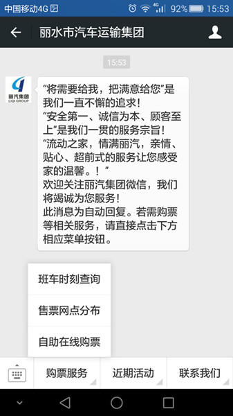 假期將至,為滿足旅客多樣化的購票需求,現(xiàn)旅客只需關(guān)注“麗汽集團”微信公眾號,就能實現(xiàn)通過手機終端直接購買從東、西汽車站始發(fā)班線的車票,還可以退票。