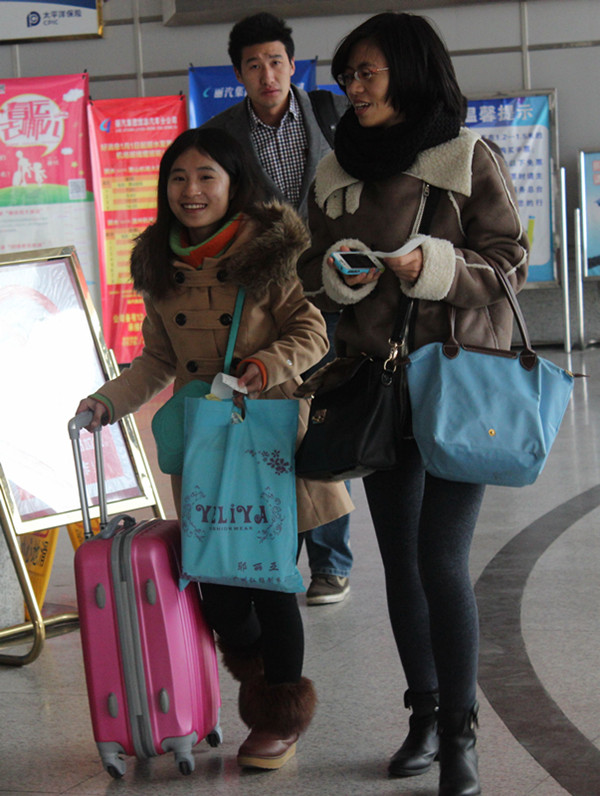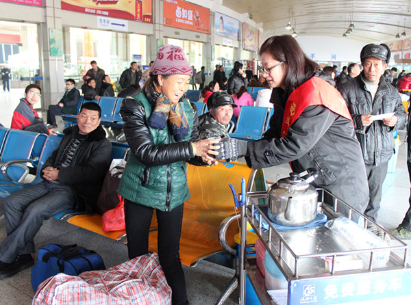 服務(wù)班的陳燕早早的推著服務(wù)車在候車室服務(wù),為春運(yùn)第一天踏上回家旅途的人們免費(fèi)送上一杯杯熱氣騰騰的開水。陳燕說,為旅客服務(wù)是她的本職工作,農(nóng)民工兄弟們?cè)谕夤ぷ髁艘荒瓴呕匾惶思?,她和姐妹們要盡自己所能,為他們提供最優(yōu)質(zhì)的服務(wù)。服務(wù)班已備好了生姜茶,隨著氣溫的下降,姐妹們將會(huì)推車送姜茶服務(wù),為他們回家的途中送上一抹溫暖。