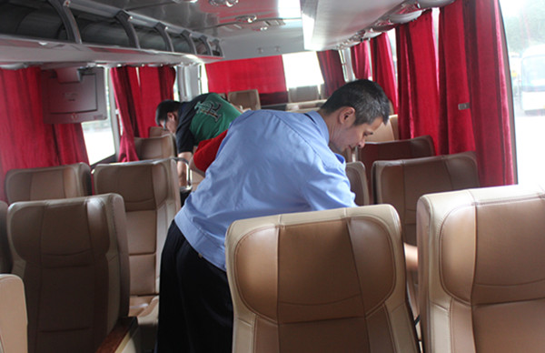 | 中秋、國慶雙節(jié)接踵而至,為切實做好2015年國慶節(jié)日運輸工作,確保廣大旅客安全、舒適、快捷、有序出行,9月23日下午,客運西站聯合駐站運管開展中秋、國慶節(jié)前安全大檢查。本次檢查的重點為:營運車輛的滅火器、安全帶配備情況,站內所有消防設施、報警設施是否有效,崗位工作人員規(guī)范操作,“三不進站六不出站”制度落實情況,站場消防設施及各經營戶滅火器配備情況。檢查人員認真逐一進行了排查,對檢查中發(fā)現的問題,堅決進行整改,絕不讓隱患存在。 西站保衛(wèi)稽查人員正在檢查座位安全帶 |