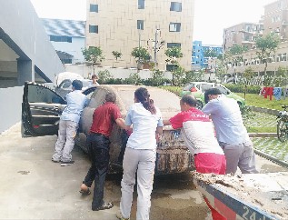 8月21日凌晨5點,公司微信事故群就滴滴的開始叫喚,這時候水東片區(qū)的水位已經(jīng)基本恢復原位,馬路上堆滿了水位退去的生活垃圾、沼泥,空氣中彌漫著災后的油臭味。他們又開始了忙碌的一天,今天的任務是先將客戶車輛安全的轉(zhuǎn)移到可轉(zhuǎn)移點,男生們負責體力活,推車拉車,銷售部的女生們負責守點看車,聯(lián)系客戶。