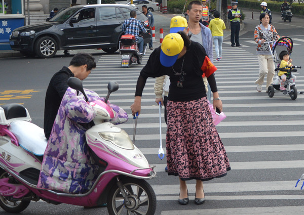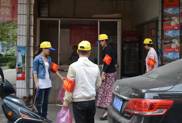 在大洋路上的一家小吃店門口,停的車子多,地上的煙頭也很多?!靶↑S帽”們看到后,先到店里和老板娘講門前三包的要求,勸導(dǎo)店老板要做好自己門前的保潔工作,然后彎腰把這些煙頭撿干凈。老板娘看著大家,慚愧的說:“不好意思,不好意思,沒有及時掃干凈。你們天天來,做的真好!”