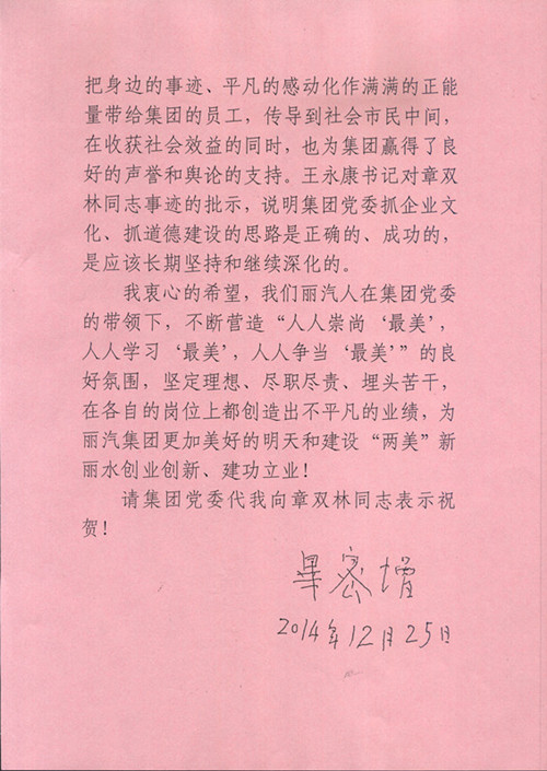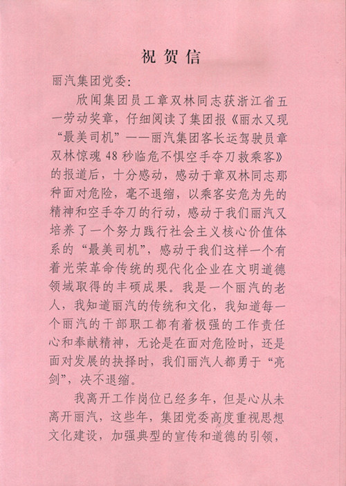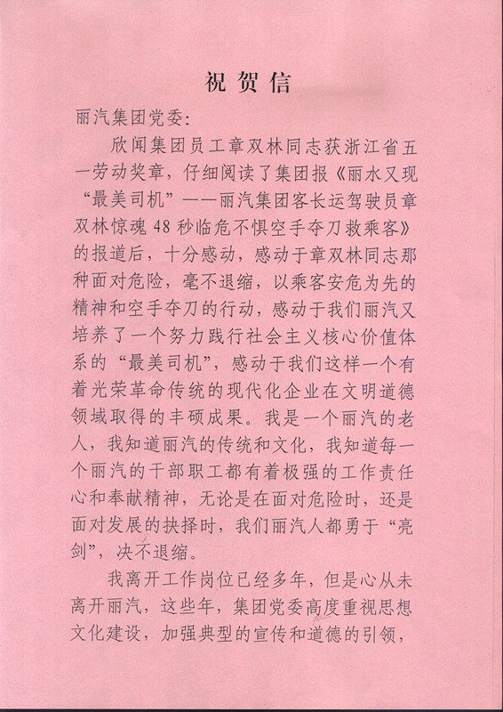 集團(tuán)公司客長運(yùn)司機(jī)章雙林臨危不懼空手奪刀的先進(jìn)事跡,不僅受到全社會的高度關(guān)注,在感動著社會、感動著廣大員工的同時,也感動了離退休老同志。25日,集團(tuán)公司離休干部、年逾90高齡的畢密增同志專門發(fā)來賀信,高度肯定了集團(tuán)公司的思想文化建設(shè),也表達(dá)了對章雙林的祝賀。