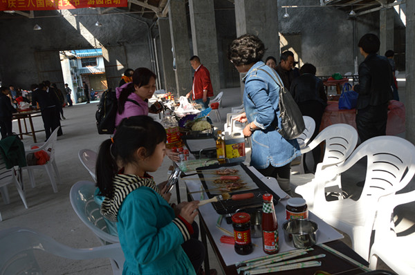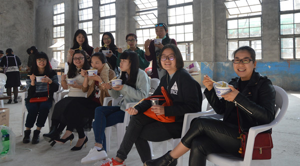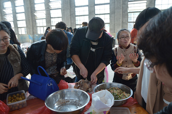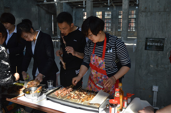 這邊包餃子的問題正討論的激烈,那邊熱氣騰騰的豬頭也出鍋了?!把剑@么大的豬頭,小時候過年的感覺”?!皩Π?,對啊,這種氣氛,這種味道,太有紀念意義了”?!皝韥韥恚遗膹堈掌?,微信朋友圈曬一曬”。黃色餃子、綠色餃子、紅色餃子、紫色餃子相繼的出鍋了,燒烤的食品也相繼出爐,大家互相品評,因為都是自己動手參與,一切都變成了美食。
