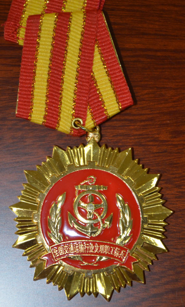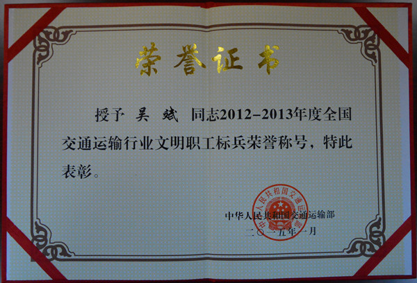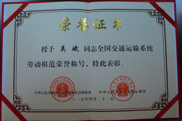 吳斌(左)榮獲全國(guó)交通運(yùn)輸系統(tǒng)勞動(dòng)模范、全國(guó)交通運(yùn)輸行業(yè)文明職工標(biāo)兵稱號(hào)