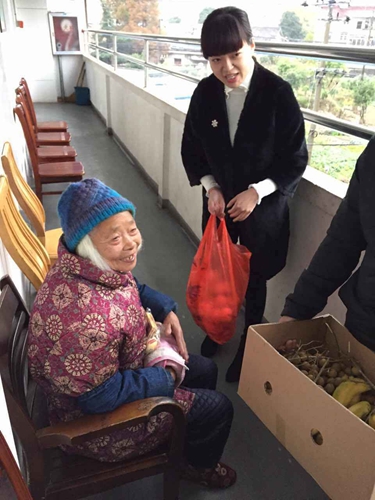 當我們的團員為老人捧上水果時, 老人們甚至微笑著流下感動的淚水,看著老人們眼含淚花的樣子,我們的內(nèi)心有股莫名的心酸,也為自己參加今天的活動而感到激動和自豪。