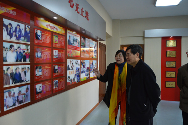 在麗汽集團(tuán)榮譽(yù)室,工會主席呂麗君向李良福副廳長介紹涌現(xiàn)出的各類先進(jìn)典型