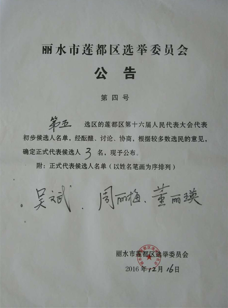 麗水市蓮都區(qū)選舉委員會公告(第四號)