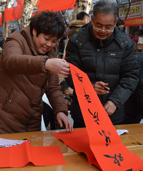 幾張小桌子拼成的簡易書案更是黨員一條街上靚麗的風(fēng)景。三位老同志一落筆,書案旁邊一下子就圍滿了人,大家一邊排隊(duì)等候著“墨寶”,一邊點(diǎn)贊著三位老師的書法。葉女士高興地說:“手寫的春聯(lián)不僅更有年味,而且還是在弘揚(yáng)中國的書法藝術(shù)。中國傳統(tǒng)的年俗文化,現(xiàn)在已經(jīng)越來越難得了?!币粚?duì)雙胞胎寶寶的父母恰巧推著嬰兒車從服務(wù)點(diǎn)前經(jīng)過,趕緊請(qǐng)老師寫下“開心寶貝”四個(gè)字,還說是給孩子倆最珍貴的新年禮物。