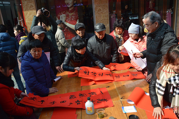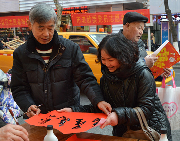 雖然時(shí)節(jié)已過立春,但農(nóng)歷臘月十九(2月7日)的早上還是寒意逼人,麗汽集團(tuán)的黨員們卻一早就來到中山街路段,面向廣大群眾展開了春節(jié)班車時(shí)刻咨詢、汽車銷售維修服務(wù)和送春聯(lián)、送福字三項(xiàng)服務(wù)。退休老黨員蘭延生、陳根松、王法根三人更是現(xiàn)場(chǎng)潑墨揮毫,冒著嚴(yán)寒為現(xiàn)場(chǎng)的群眾書寫春聯(lián),送去新春祝福。短短半天時(shí)間里,黨員們共發(fā)放春運(yùn)班車時(shí)刻表、汽車銷售維修資料500份,解答咨詢76人次,贈(zèng)送福字1800張,為群眾現(xiàn)場(chǎng)書寫春聯(lián)450幅,惠及群眾1500人次。
