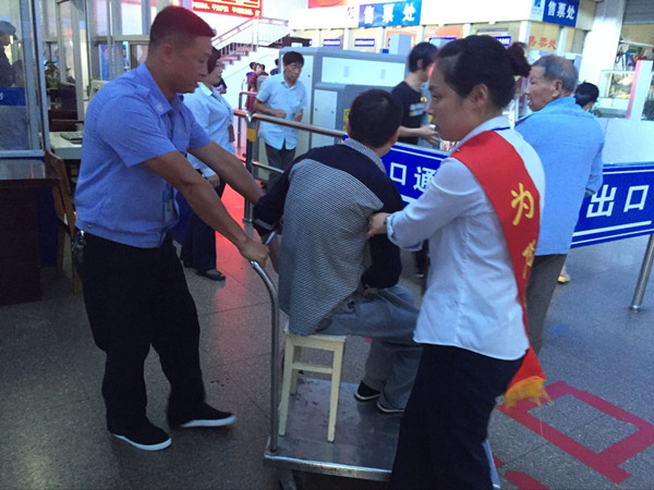 旅客在服務(wù)臺坐下后,熊宣標(biāo)照顧旅客,戴宏星和服務(wù)組的余靜到工作間找輪椅,不巧輪椅送去維修了,他倆靈機一動,就用行李車和小方凳拼湊成了一輛特殊的“輪椅”。他們?nèi)她R力把旅客扶上輪椅,一路護送到檢票口,還開通綠色通道,提前為旅客檢票、攙扶旅客上車,感動得這對夫妻一個勁地說遇到好人了,周圍的旅客看見了這一幕,也紛紛豎起大拇指,拿出手機記錄這感人的瞬間。