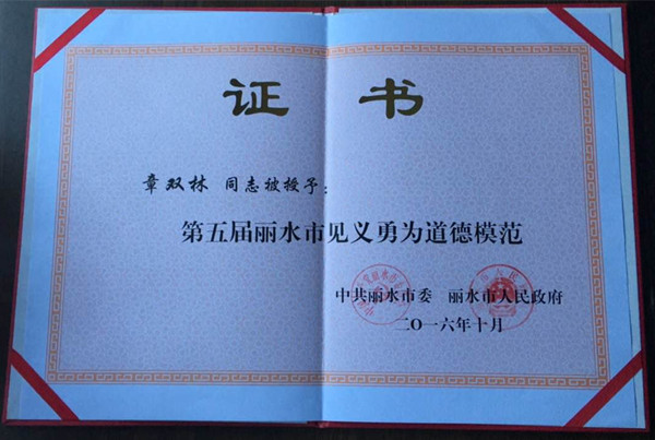 12月9日,蓮都區(qū)委區(qū)政府在蓮都劇場召開表彰會,表彰蓮都區(qū)第五屆道德模范獲獎?wù)摺{惼瘓F(tuán)長運公司駕駛員章雙林同志獲見義勇為道德模范受到表彰。 在10月31日,章雙林還獲得麗水市第五屆見義勇為道德模范,受到市委市政府表彰。