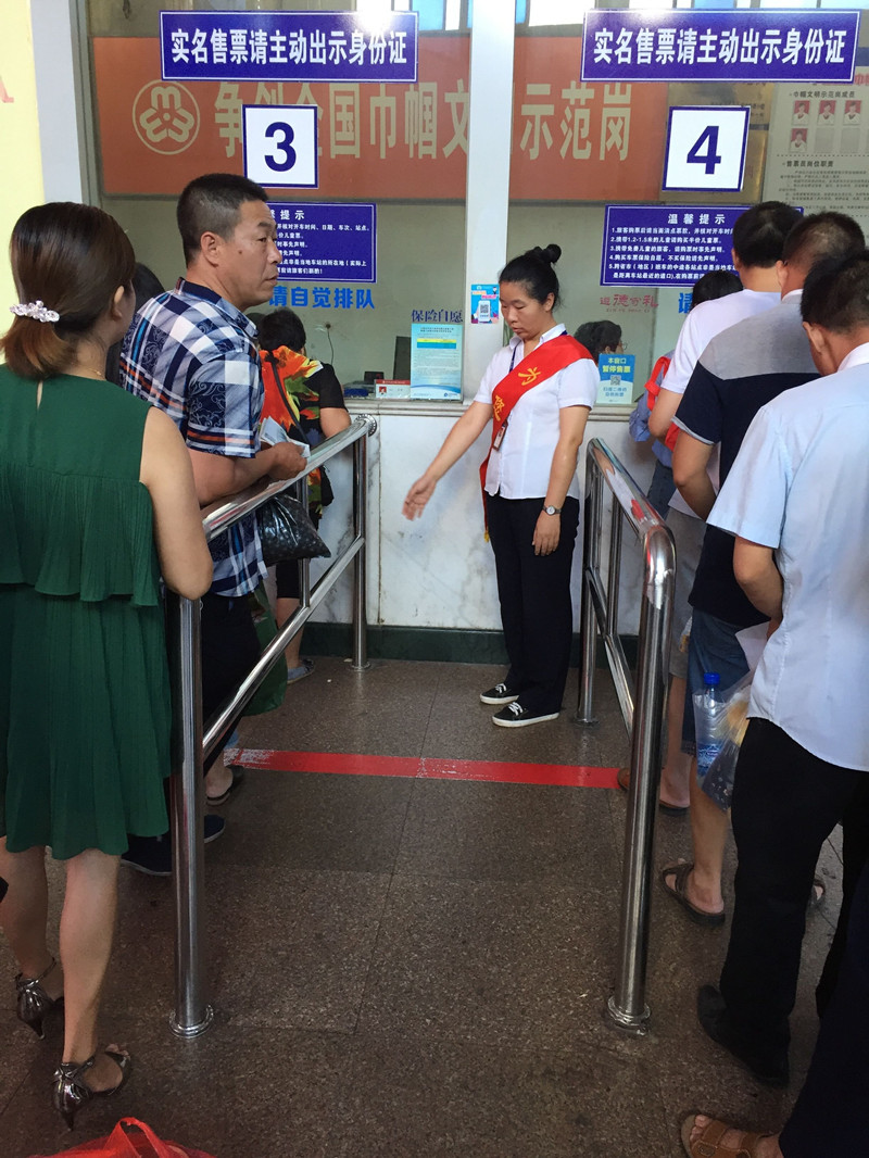 “您好!請(qǐng)不要越過(guò)紅線,請(qǐng)站在一米線后等待,”售票廳里尤麗娟正耐心地對(duì)正在排隊(duì)買票的旅客進(jìn)行勸導(dǎo)。