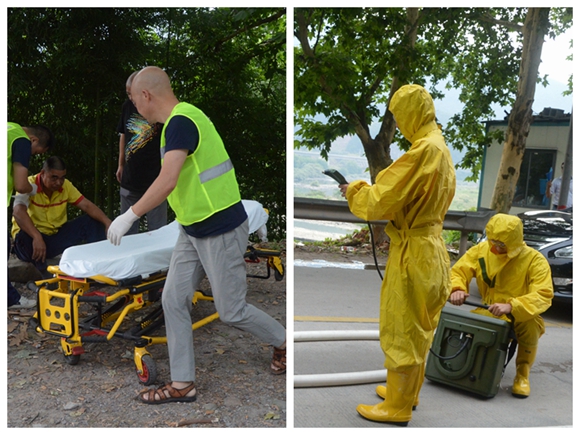 120趕到救治傷員、環(huán)保監(jiān)測人員進行現(xiàn)場監(jiān)測