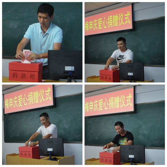 6月29日下午3時,愛心捐款儀式在汽校教室舉行。校領(lǐng)導帶頭捐款,汽校教練員工也積極參加,大家都踴躍地為梅申慶向上了自己的一份愛心,還有兩位學員還專門托教練捎來了捐款。短短幾分鐘內(nèi),就為梅申慶募捐到愛心款 3055元。汽校的金健飛校長更是在第一時間將這份汽校家人的關(guān)愛送到了在醫(yī)院接受化療的梅申慶手中。
