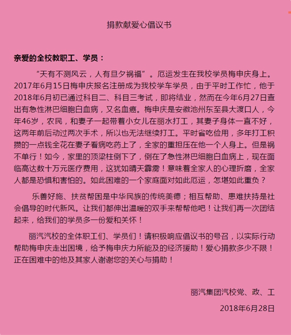6月27日,麗汽集團汽車技術(shù)學校的微信公眾號收到一條來自學員的消息:“我是麗汽汽校的一名學員,突患急性淋巴細胞白血病,希望汽校領(lǐng)導能幫我籌點款,謝謝!”