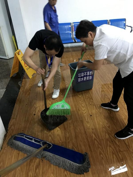 4月24日下午2點(diǎn)后,由于受強(qiáng)對流云團(tuán)影響,市區(qū)出現(xiàn)了7-9級大風(fēng),并伴有強(qiáng)雷電和大暴雨。由于這場雨下得又大又急,東站新舊候車廳交界處的下水管出現(xiàn)了倒灌現(xiàn)象,短短幾分鐘時(shí)間,新候車廳5、6號檢票口附近的地面就積滿了水。值班站長金翔見狀趕緊叫來工作人員和清潔工,不顧地面的積水和正在往下漏的雨水,合力進(jìn)行積水清理。他們拿起掃把、畚斗、垃圾桶、拖把等工具共同加入戰(zhàn)斗,一邊清理一邊不忘提醒過往的旅客注意腳下,防止滑倒。