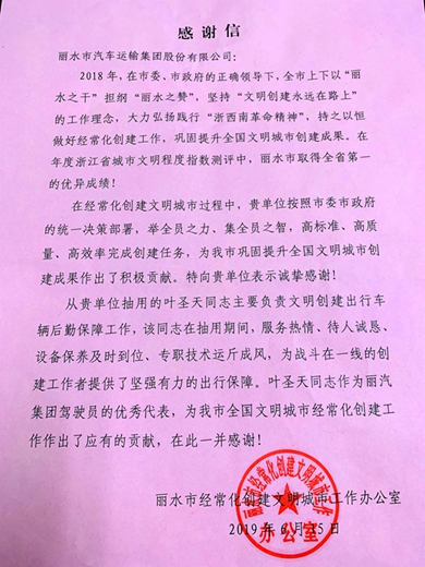 信中還特別表揚了從集團公司抽用的葉圣天同志,在工作中服務(wù)熱情、待人誠懇、設(shè)備保養(yǎng)及時到位、專職技術(shù)運斤成風(fēng),為戰(zhàn)斗在一線的創(chuàng)建工作者提供了堅強有力的出行保障。葉圣天同志作為麗汽集團抽用的、主要負責(zé)文明創(chuàng)建出行車輛后勤保障工作的優(yōu)秀駕駛員代表,為我市全國文明城市經(jīng)常化創(chuàng)建工作作出了應(yīng)有的貢獻。