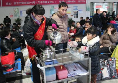 2月8日冷空氣來襲,雨夾雪,一大早西站“流動之家”服務(wù)班的姐們就準備好一大壺熱氣騰騰的姜茶,并將一杯杯熱氣騰騰的姜茶送給返鄉(xiāng)旅客,在幫助他們抵御嚴寒的同時使他們從內(nèi)心感受到“家”的溫暖與關(guān)愛。