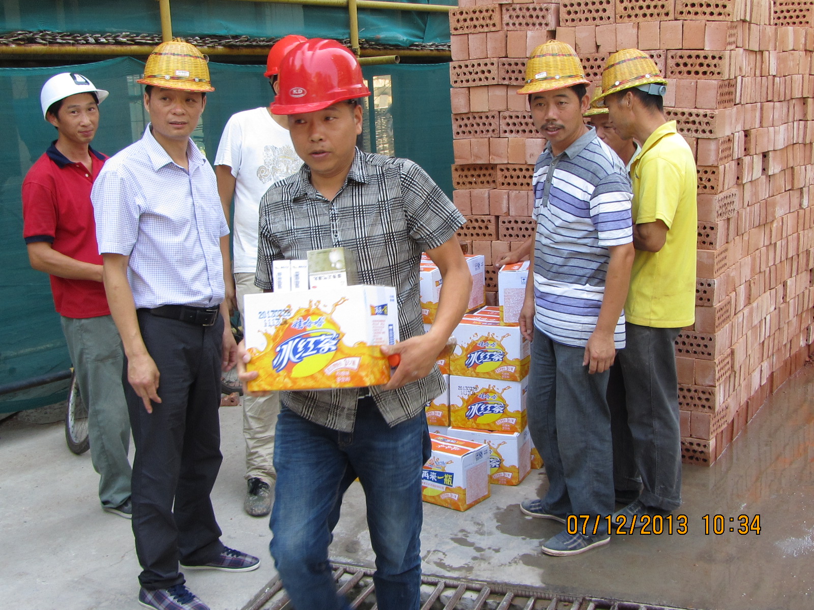 當(dāng)前,夏日炎炎,驕陽似火,正值建筑施工生產(chǎn)旺季,金龍.長(zhǎng)運(yùn)花苑工地的工人師傅們頂著高溫酷暑辛勤地工作。2013年7月12日,南明房地產(chǎn)公司工程部在公司副總經(jīng)理的帶領(lǐng)下,帶著清涼食品和防暑保健藥品到施工現(xiàn)場(chǎng)積極開展“夏日送清涼”活動(dòng),給奮戰(zhàn)在一線的建筑工人送去項(xiàng)目部的關(guān)懷和慰問。并叮囑大家在高溫作業(yè)時(shí),要合理安排作息時(shí)間,做好防暑降溫工作,并要求項(xiàng)目部做好食堂的飲食和疾病防疫等工作,在施工現(xiàn)場(chǎng)按照公司規(guī)定配備安全生產(chǎn)和職業(yè)防護(hù)設(shè)施,加大對(duì)工人的防暑降溫和中暑急救知識(shí)的宣傳教育,確保工人的身體健康和安全施工。
