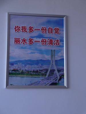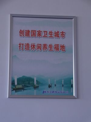 現(xiàn)在,墻上懸掛的是創(chuàng)衛(wèi)口號(hào)與麗水山水風(fēng)光相結(jié)合的宣傳畫,賞心悅目。