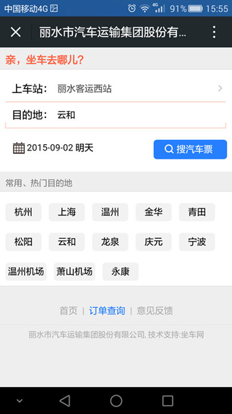 (3)點擊“購票”,進入購買服務(wù)頁面,在上車站位置選擇“麗水客運東站”或“麗水客運西站”。
