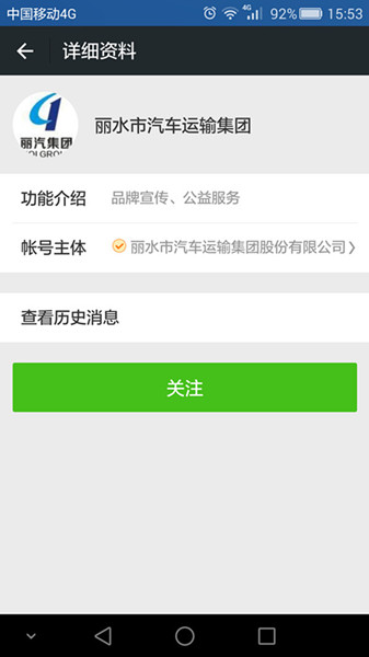 (1)打開微信,搜索添加“麗水市汽車運輸集團”微信公眾號或直接掃取二維碼,點擊關(guān)注。