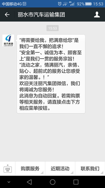 假期將至,為滿足旅客多樣化的購票需求,現(xiàn)旅客只需關(guān)注“麗汽集團”微信公眾號,就能實現(xiàn)通過手機終端直接購買從東、西汽車站始發(fā)班線的車票,還可以退票。