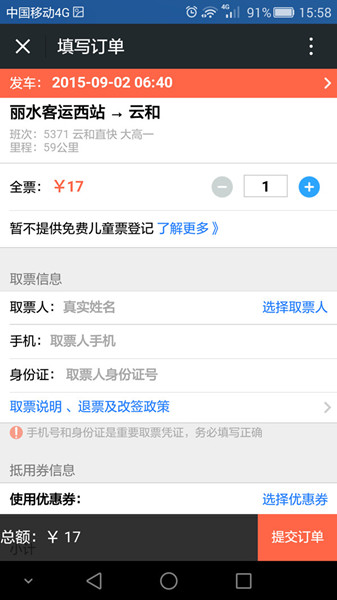 (4)點擊選擇需乘坐的班次,進入填寫頁面,填寫取票人姓名、手機號碼及身份證。