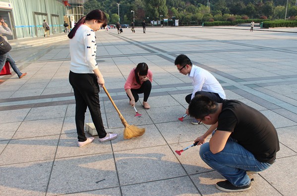 鏟刀、清潔刷、掃把、水管……清潔工具一一分配到手中之后,大家便熱火朝天的干起來。雖已入秋,但午后的太陽依然刺眼,沒一會(huì)兒,大家都開始冒汗,但誰也沒停下手中的勞動(dòng),依舊頂著太陽蹲在地上鏟口香糖或是奮力地洗刷地面。