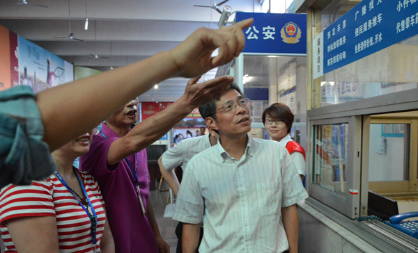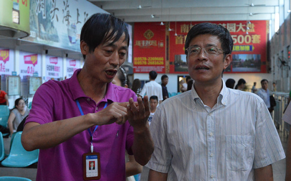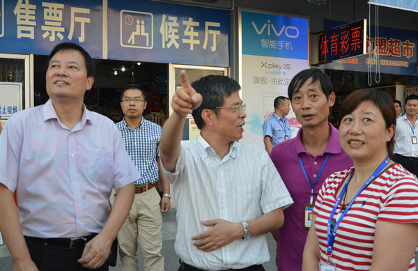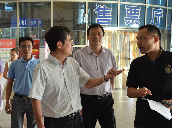 在客運(yùn)西站,陳部長一行察看了售票大廳、候車室前廳等地方??吹绞燮贝髲d內(nèi)文明旅游引導(dǎo)員正在引導(dǎo)旅客有序排隊(duì)購票,文明旅游公益宣傳提示牌擺放整齊,兩處文明旅游標(biāo)語均按規(guī)定陳列醒目時(shí),陳部長對(duì)西站的工作也給予了充分肯定。在進(jìn)一步了解情況后,陳部長對(duì)身邊的運(yùn)管部門負(fù)責(zé)人說:“西站的問題不在站內(nèi),主要在出租車管理和黑車的打擊,運(yùn)管部門要做好管理工作?!彪S后與各部門負(fù)責(zé)人一起商議了出站口出租車管理措施、硬件改造等問題。