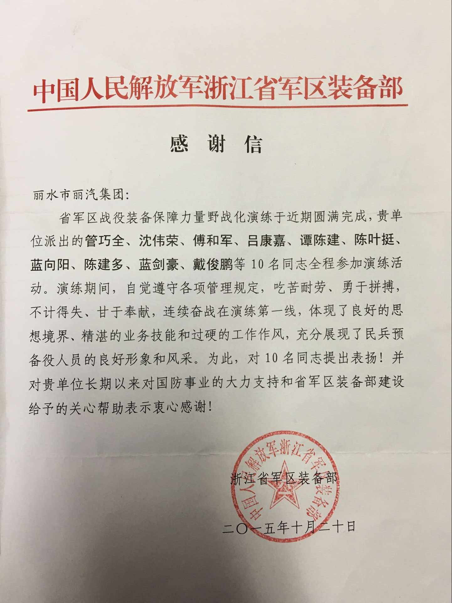 11月19日,麗汽集團(tuán)收到浙江省軍區(qū)裝備部的一封感謝信。信中對(duì)來自快客、伊翔、長運(yùn)、甌龍等公司的修理工予以了表揚(yáng),充分肯定了麗汽員工在參加省軍區(qū)裝備部組織的戰(zhàn)役裝備保障力量野戰(zhàn)化演練中的優(yōu)異表現(xiàn)。