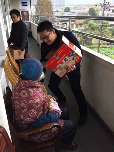 經(jīng)過20多分鐘的車程,我們到達了靈山敬老院,那里很安靜祥和,大家都激動不已。因為事先聯(lián)系過,一下車,就有許多老人在門口等候我們了??粗覀儙淼囊幌湎涞乃秃脦状娘灨傻案鈺r,身旁的老人就一直沖著我們說:“你們太好了,還買這么多東西給我們,真是當不起的”。我們十余名團員迅速分工,有的將水果和餅干分箱裝袋,有的負責派送三樓的老人,有的負責派送二樓的老人,經(jīng)過一個多小時的努力,我們終于全部派送完全部的物品。